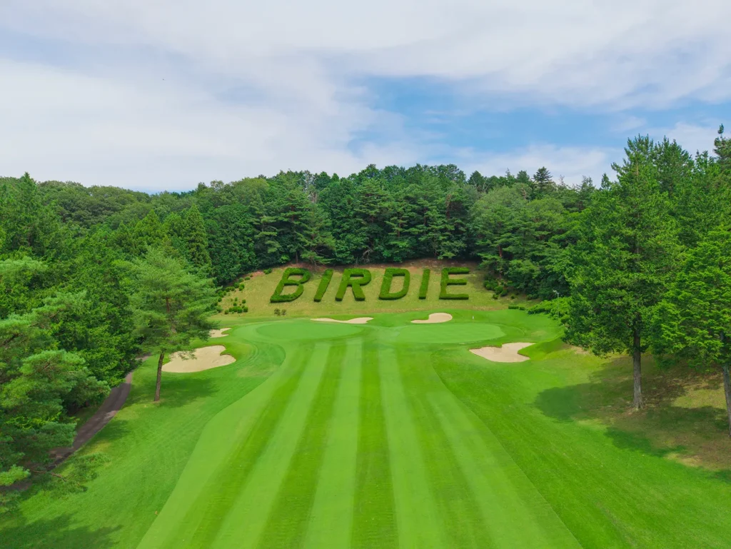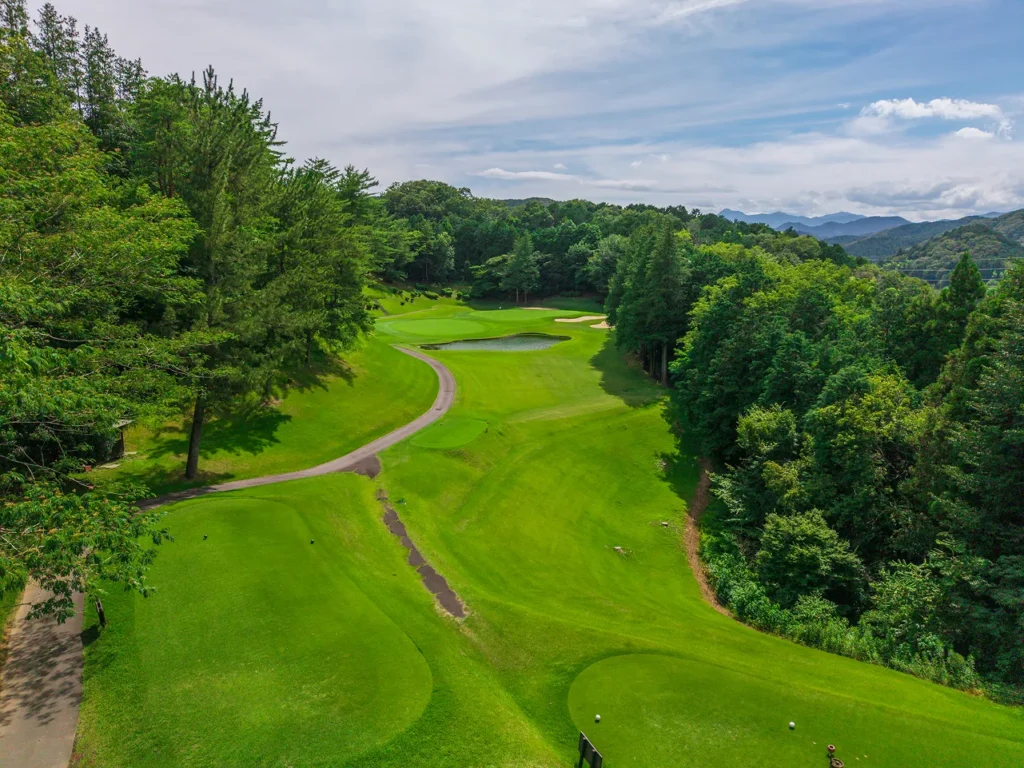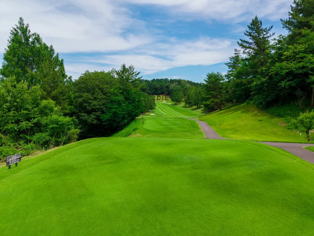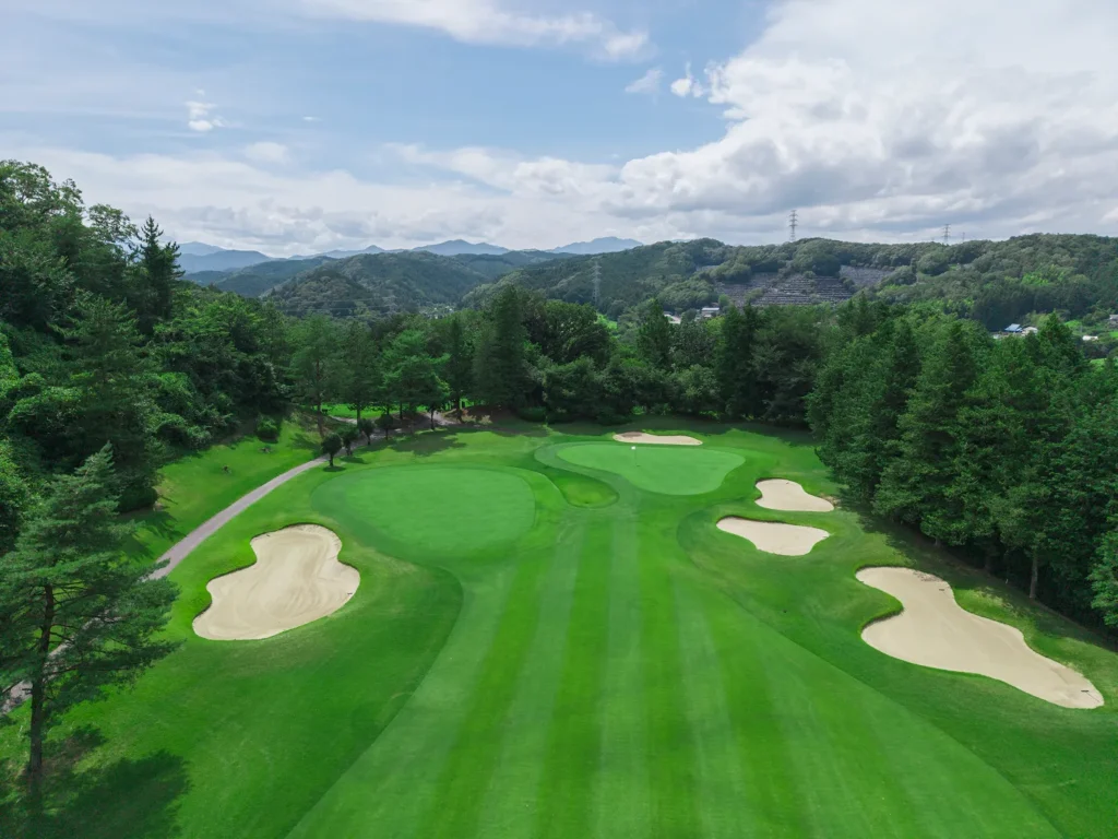グリーンまでは緩やかな打ち上げ。グリーンは近くに見えるが稜線より奥にあるため、距離を確実に把握することが必要。藤グリーン手前にはアリソンバンカーがあるので要注意。