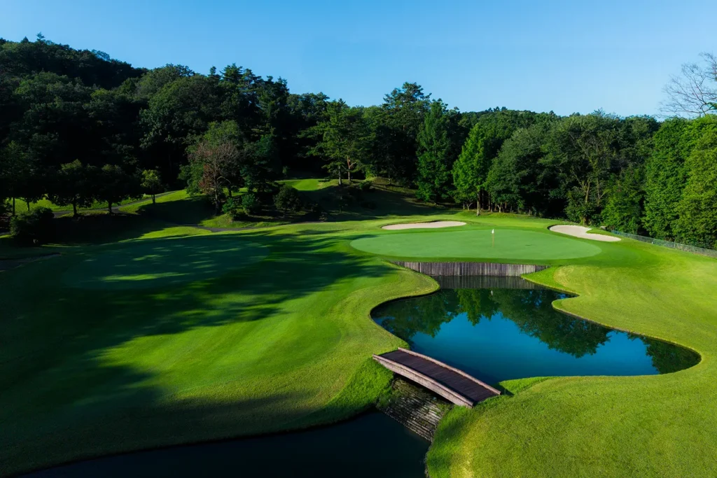右には藤グリーンの手前に接した太鼓橋の架かった池、左には岩から落ちる滝のある池が配された美しいショートホール。
